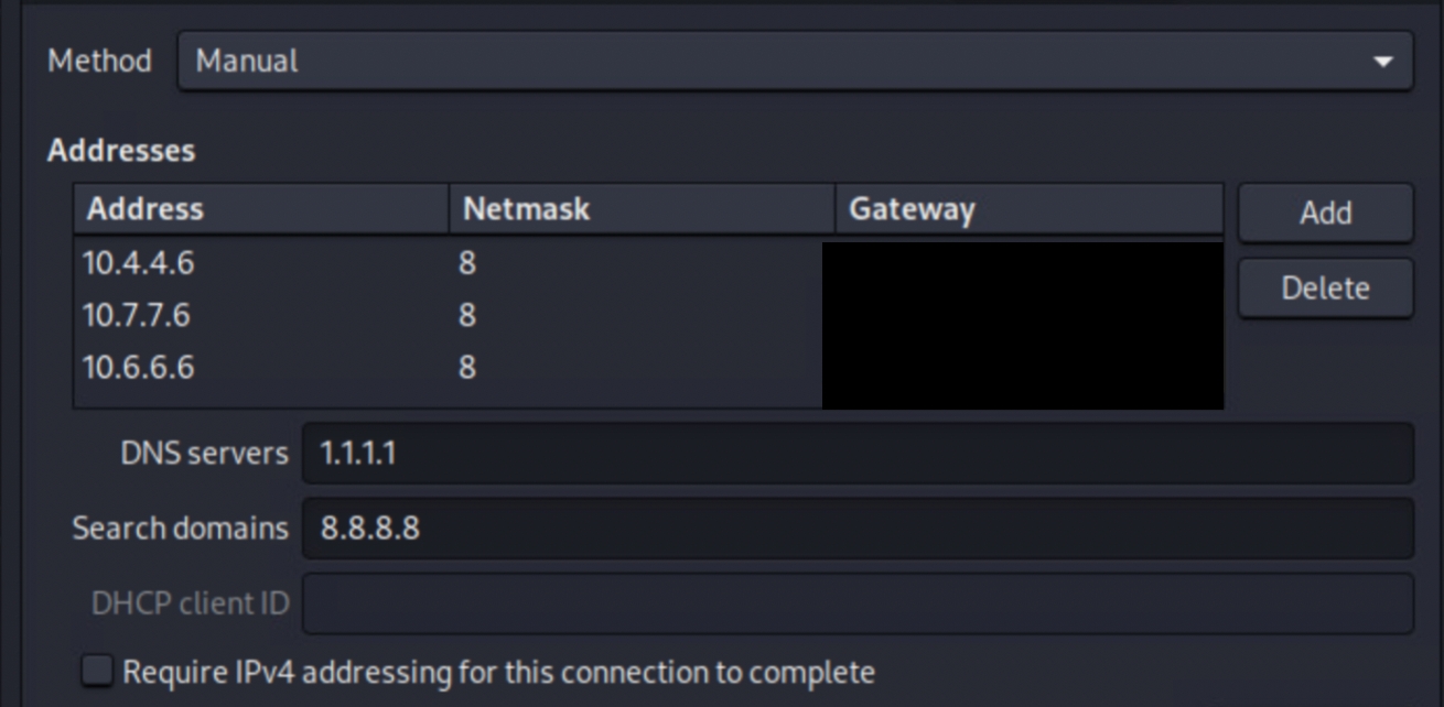 6. Kali Linux allows for multiple IP addresses to be set manually on an interface, allowing for you to set multiple callbacks in case one of your IP addresses gets banned. The following demonstrates a screenshot of this: